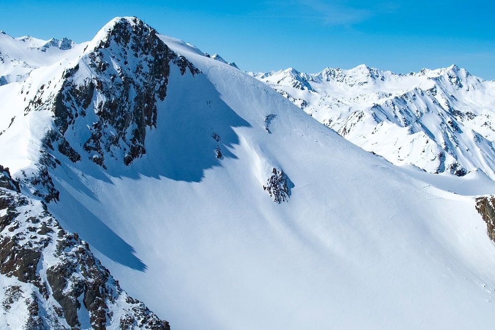 View on the snowy Tiroler Alps in Austria during a beautiful winter day. The mountains around the Linker Fernerkogel are seen from the Tiefenbachkogel ski slopes of the Sölden Ski Area near the Ötztal in Tyrol.