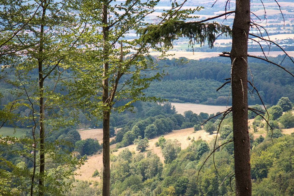 Beautiful wide view over mountains and forests in the Thuringia Forest with castle or old house in the valley.