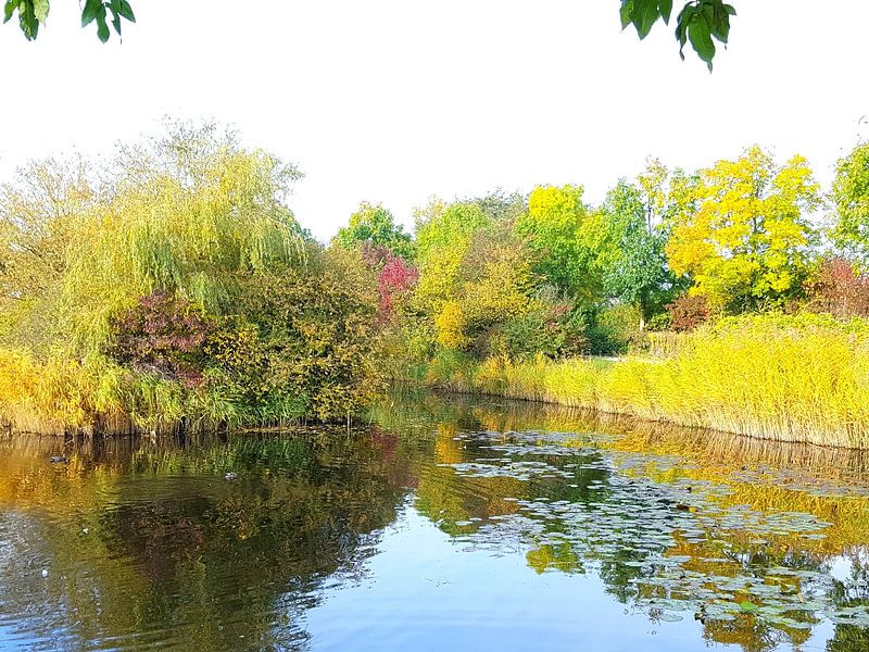 Vijver omringd met bijzonder gekleurde begroeiing. De bomen weerspiegelen in het water. Door de beginnende herfst zijn de bomen in verschillende tinten gekleurd.
