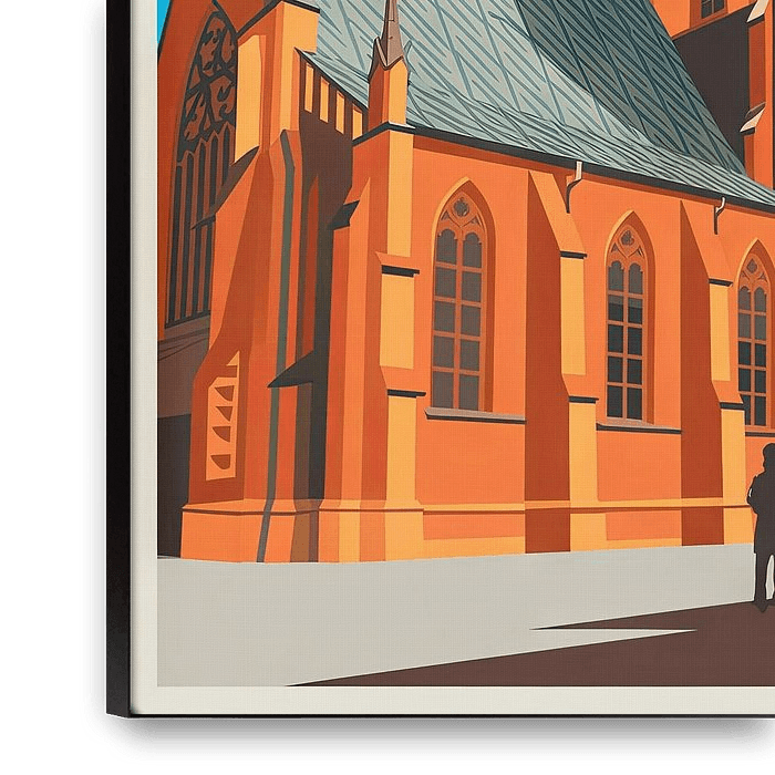 A majestic tower reaches for the sky, while the warm, orange-coloured bricks reflect the gentle rays of the sun. Surrounded by a clear blue sky, the scenery conveys a harmonious calm. A solitary silhouette in front of the impressive façade invites viewers to immerse themselves in the history of Vilnius and discover the magic of this city.