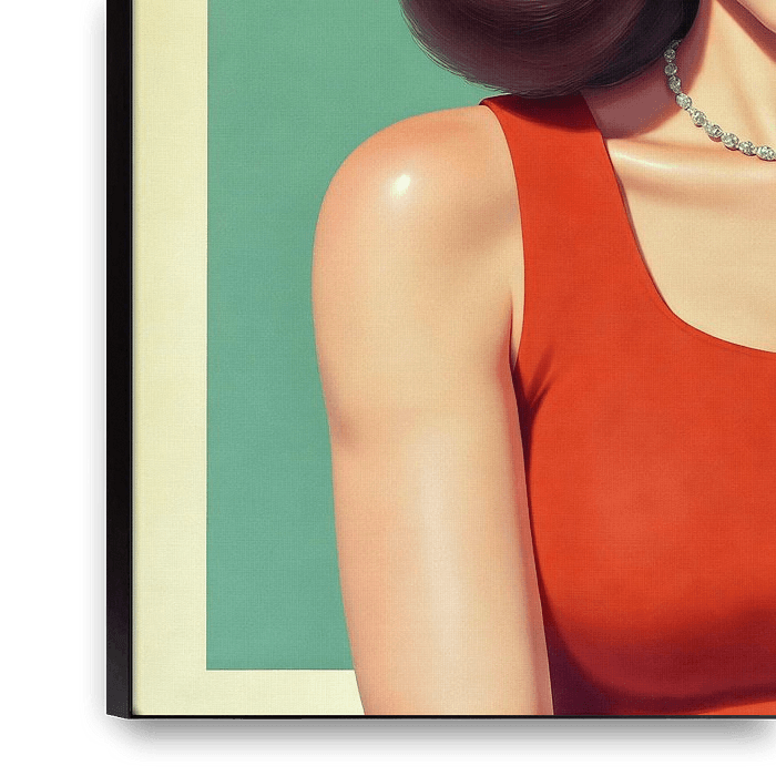 This artwork is a celebration of timeless elegance and the charm of vintage aesthetics. As the artist, I sought to capture the essence of mid-20th-century glamour, blending nostalgia with a modern twist. The central figure, a poised woman with striking green eyes and vibrant red lips, embodies confidence and allure. Her soft, voluminous…
