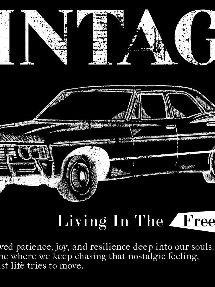 This black-and-white artwork pays tribute to vintage freedom and nostalgia. At its centre is a classic 1967 Chevrolet Impala, depicted in a graphic, raw illustration style. The powerful typography and the text "Bring back the old days with vintage" reinforce the longing for a time when everything felt simpler and freer.