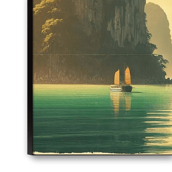 This artwork is my ode to unhurried mornings on Ha Long Bay, when the air is cool and the karsts rise like a quiet forest of stone. I wanted clarity and calm rather than spectacle, the classic travel poster balance of simple geometry, steady glow, and space to wander with your eyes. The mood is restful and hopeful, like the pause you take before the day begins.