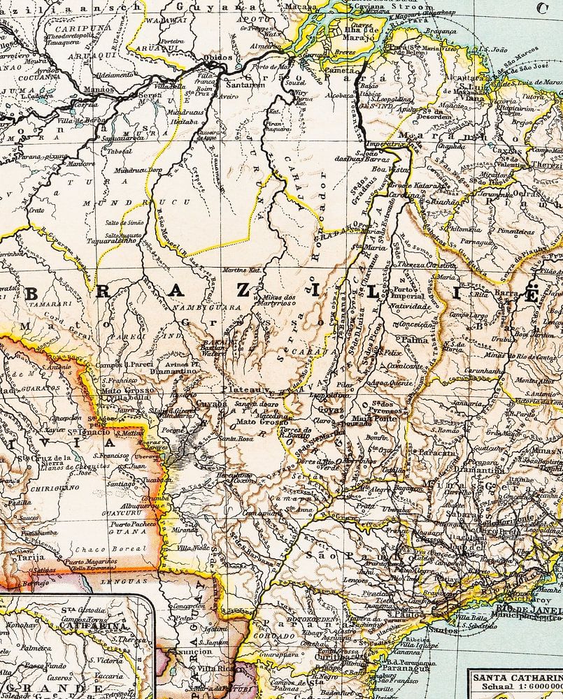 A circa 1900 antique map of Brazil. The map is in colour.