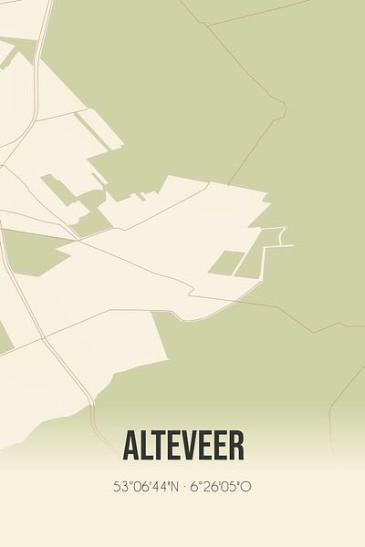 Retro map of Alteveer, located in the municipality of Noordenveld, province of Drenthe. The map shows public roads, waterways (lakes, streams and ditches) and forests in and around Alteveer. In addition, the map contains the coordinates of Alteveer.