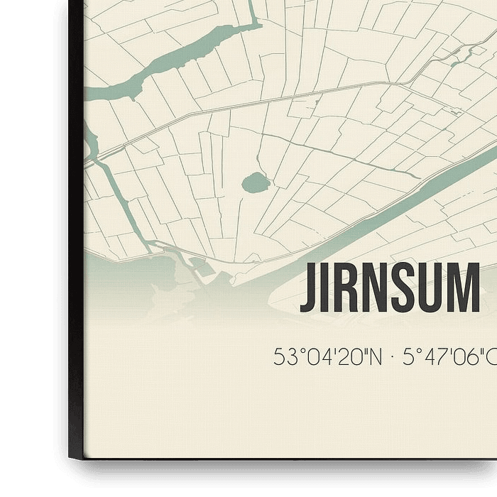 Retro map of Jirnsum, located in the municipality of Leeuwarden, province of Fryslan. The map shows public roads, watercourses (lakes, streams and ditches) and forests in and around Jirnsum. In addition, the map contains the coordinates of Jirnsum.