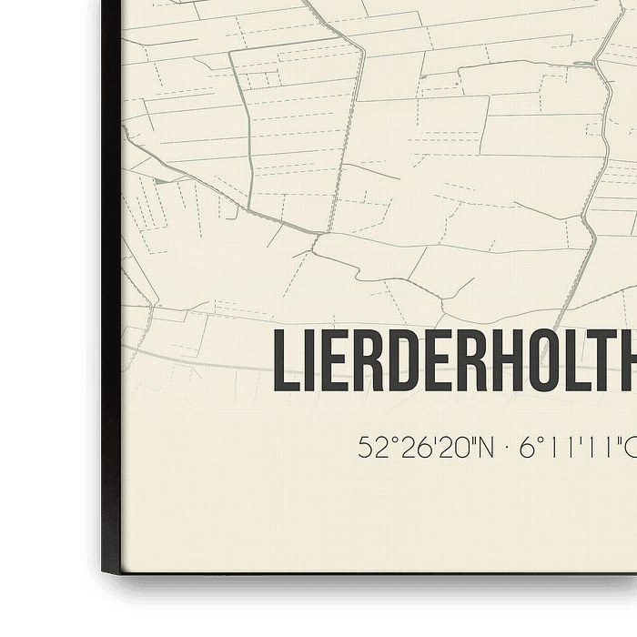 Retro map of Lierderholthuis, located in the municipality of Raalte, province of Overijssel. The map shows public roads, watercourses (lakes, streams and ditches) and forests in and around Lierderholthuis. In addition, the map contains the coordinates of Lierderholthuis.