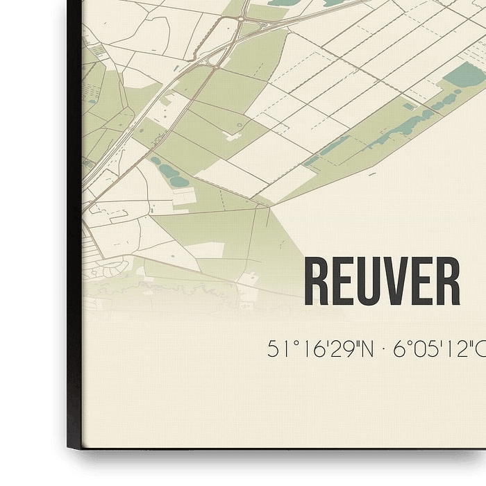 Retro map of Reuver, located in the municipality of Beesel, province of Limburg. The map shows public roads, watercourses (lakes, streams and ditches) and forests in and around Reuver. In addition, the map contains the coordinates of Reuver.