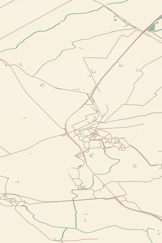 Retro map of Spijk, located in the municipality of Delfzijl, province of Groningen. The map shows public roads, watercourses (lakes, streams and ditches) and forests in and around Spijk. In addition, the map contains the coordinates of Spijk.
