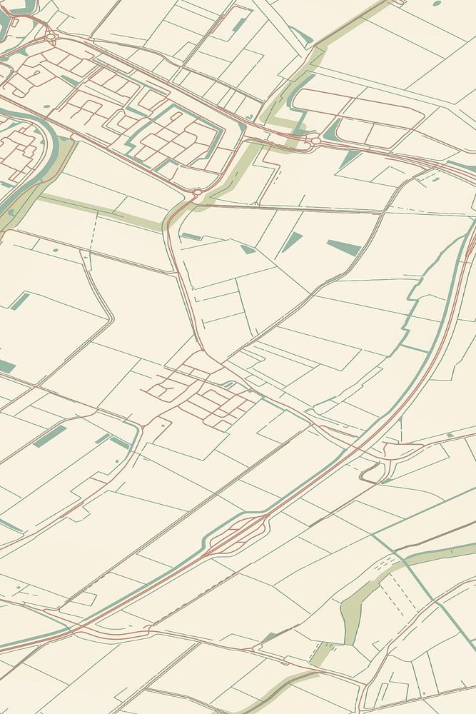 Retro map of Vierpolders, located in the municipality of Brielle, province of South Holland. The map shows public roads, watercourses (lakes, streams and ditches) and forests in and around Vierpolders. In addition, the map contains the coordinates of Vierpolders.