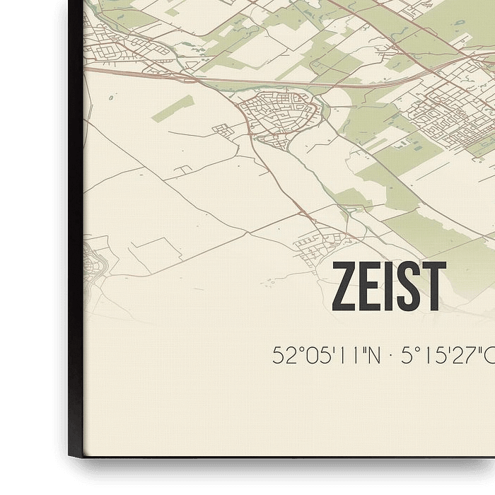 Retro map of Zeist, located in the municipality of Zeist, province of Utrecht. The map shows public roads, watercourses (lakes, streams and ditches) and forests in and around Zeist. In addition, the map contains the coordinates of Zeist.