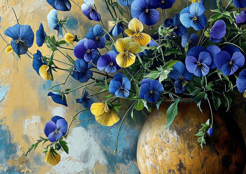 The realistic painting captures the delicate splendour of a bouquet of violets in an old ceramic vase, set against a background steeped in weathered character. The dominant colours in this artwork are a subtle yellow, deep blue and a lush purple, creating a harmonious interplay of tones.