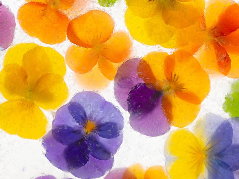 Violets caught in ice create a play of colour and light. Warm shades of yellow and orange contrast with cool purples and blues, while the ice softens and alienates the flowers. Violets in Silence shows a moment of frozen liveliness: a fragile balance between nature and time, between exuberance and stillness. The work exudes freshness…