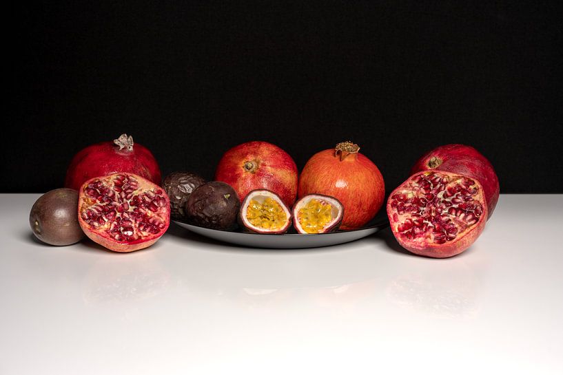 "Een meesterlijk samenspel van kleur en verstilling, waarbij de dieprode kracht van de granaatappel wordt gevangen in een zachte, moderne reflectie."