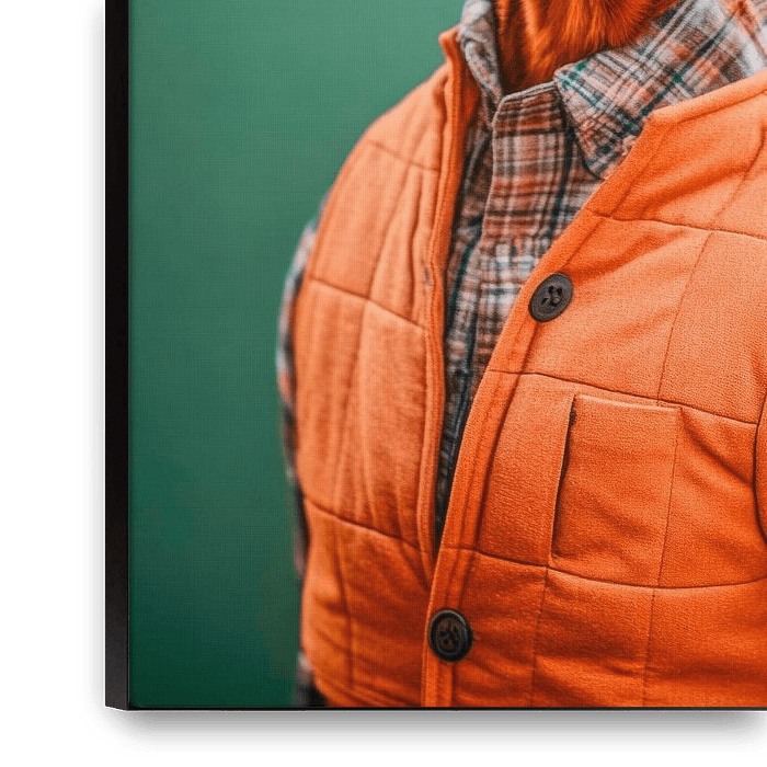 An elegant Vizsla with bright red fur and a charming expression wears a chic, beginning fashion. The look is proud and intelligent, while the stylish headgear and orange waistcoat emphasise his character. This unique combination of canid charm and human style exudes a sense of adventure and joie de vivre.