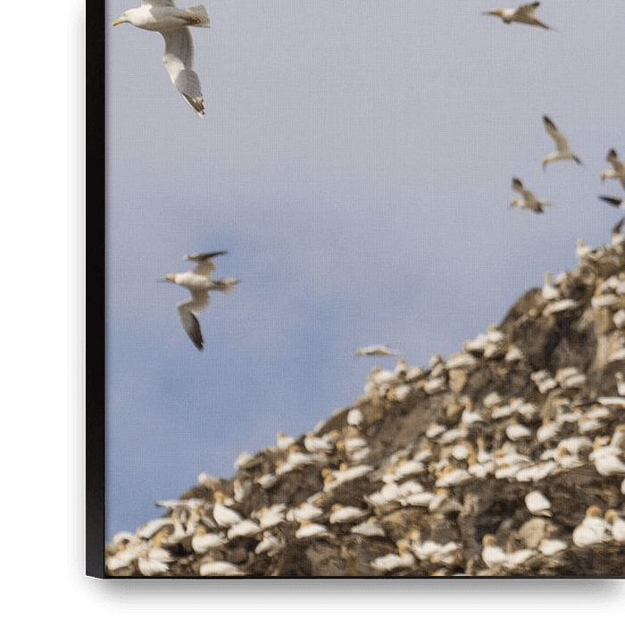 Buy this bird art Vliegende Jan-van-gent boven de kolonie by Marcel Klootwijk on canvas, ArtFrame, poster and wallpaper, printed on demand in high quality.