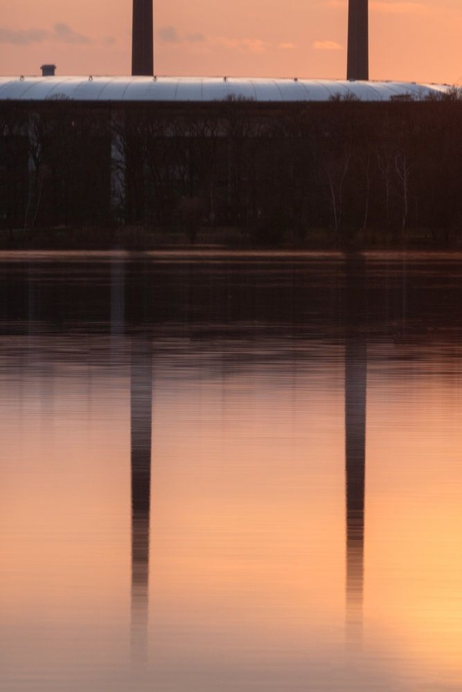 The power plant of the Volkswagen factory and the Volkswagen Arena at sunset photographed over the Allersee. The chimneys of the power plant are reflected in the lake.