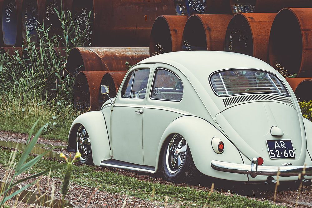 I personally like the contrast of the white (cream) car against the rusty pipes.
