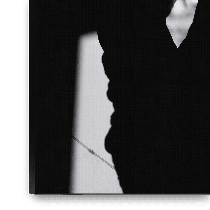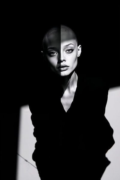A black-and-white portrait with extreme contrast. The face is divided into two halves, one side clearly illuminated, the other submerged in shadow. Only at second glance do the subtle transitions in the skin and the precise edge of light become apparent, as well as the calm, almost sculptural modelling of the lips, nose and eyes. The…