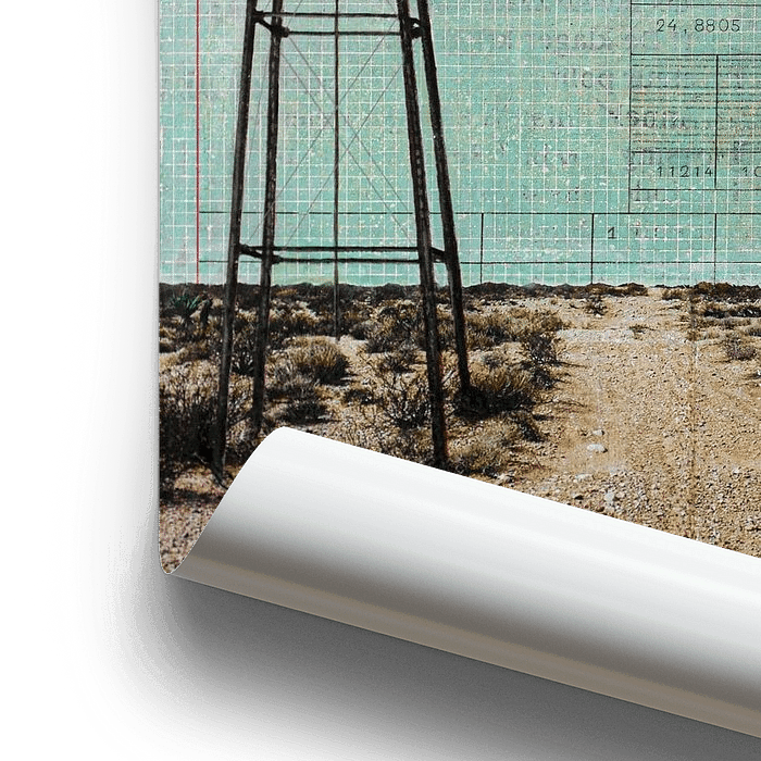 In the landscape art ‘WATER KEEPER’, a lone figure stands in a vast, arid desert landscape, his gaze fixed on an old, rusty water tower.