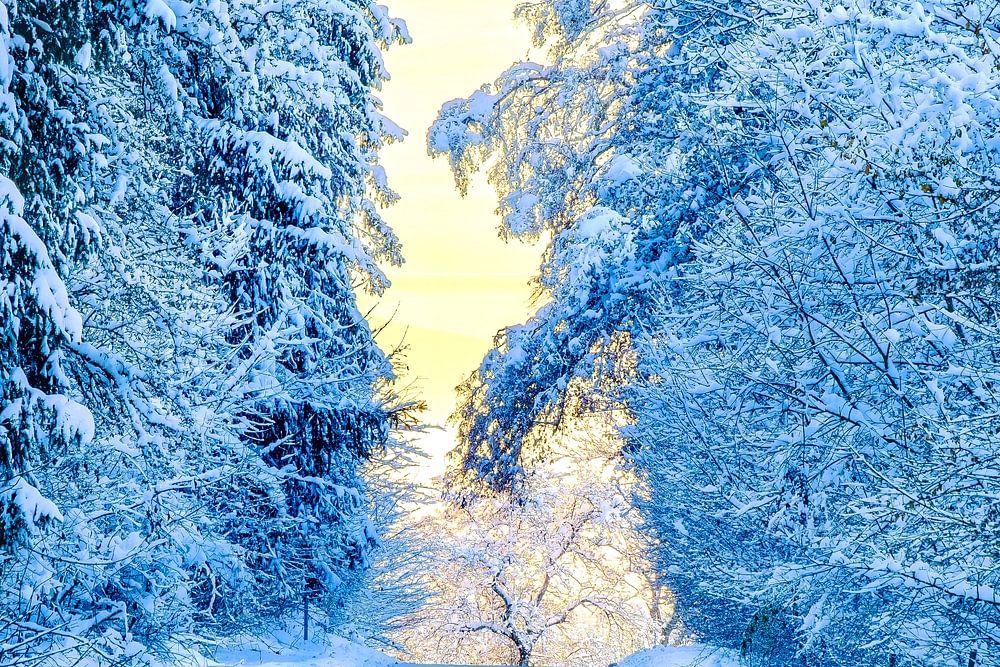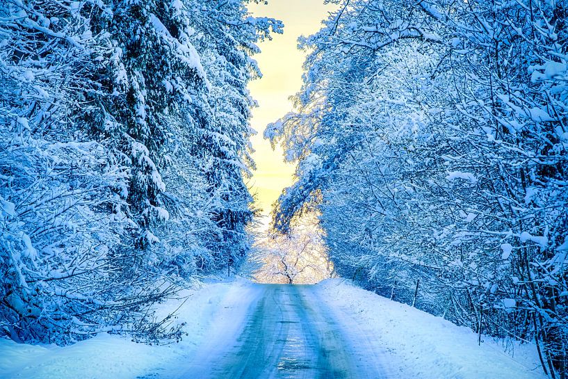 WINTER LIGHT: Evening sunlight at the end of a snow-covered country road through the forest after the onset of winter in the Swabian Alb near Münsingen, Baden-Württemberg, Germany.