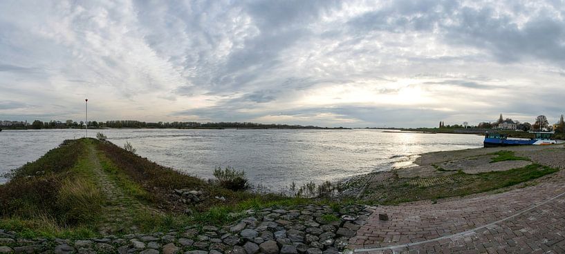 Panoramic view of the Waal River near Tiel with a foot ferry departing for Wamel.