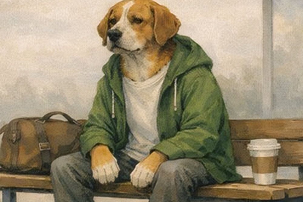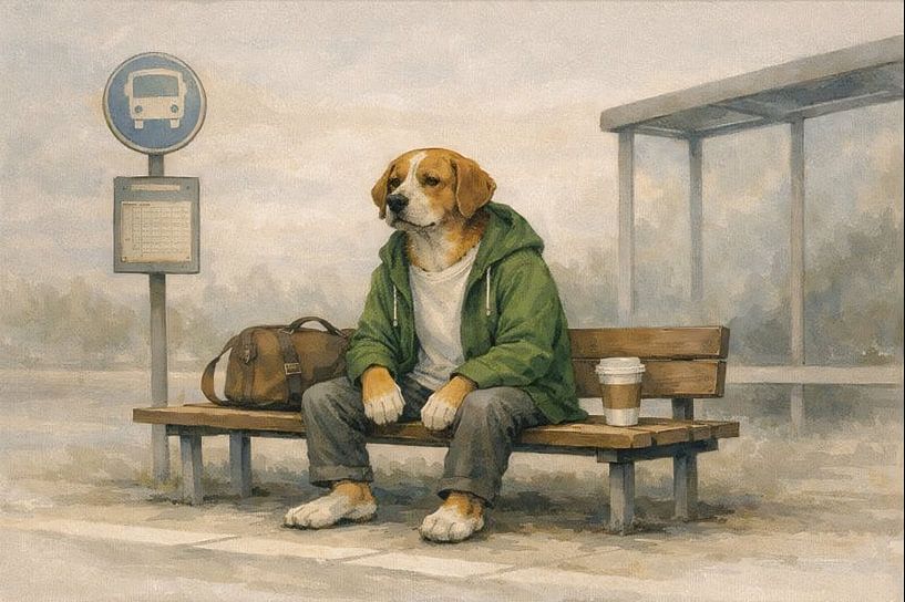 This artwork portrays a thoughtful dog sitting alone on a wooden bench at a quiet bus stop, holding a warm cup of coffee while waiting in a misty, muted environment. The scene evokes a sense of stillness, patience, and gentle melancholy, capturing a moment of calm reflection in everyday life. The painterly illustration style, combined…