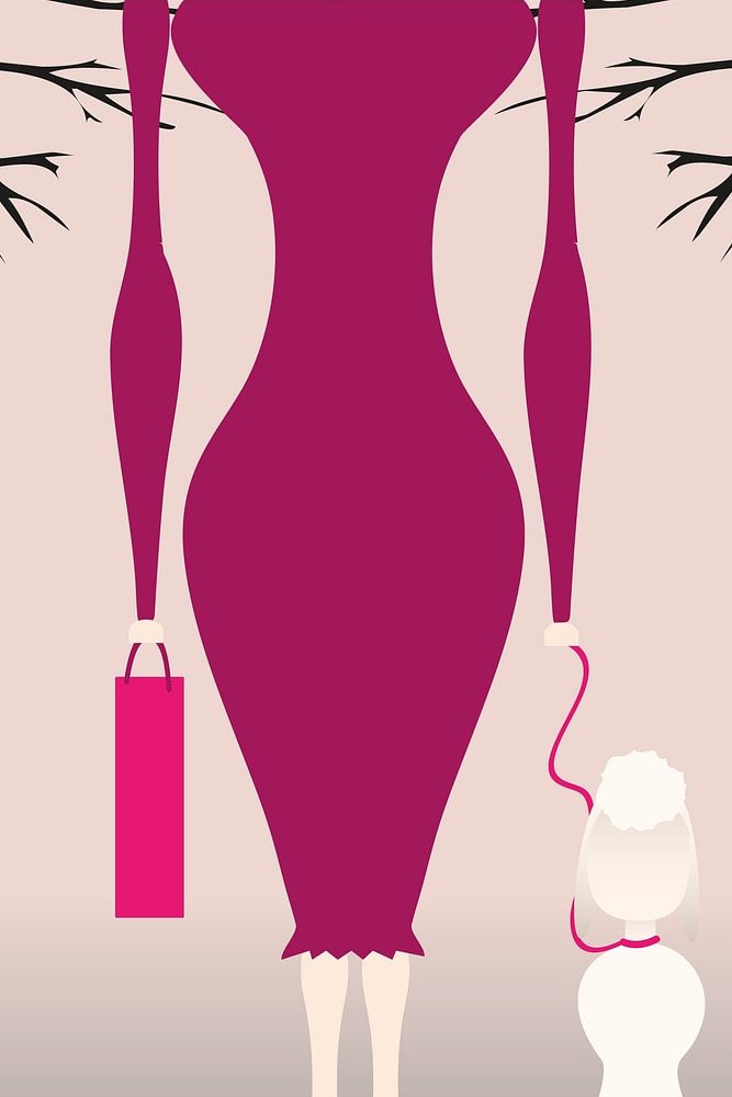 Image of a woman figure with purse in left hand and on right hand a leash on which a white poodle dog walks beside her. Person wears a large pink floppy hat, she has a slender waist and wide hips. Her clothing is aubergine coloured. To her left and right a block styled building and treetop at end of street .Below piece of a sea crossing. Image d'une figure féminine avec un sac dans la main gauche et une laisse à droite avec un chien caniche blanc marchant à côté d'elle. La personne porte un grand chapeau souple rose, elle a une taille fine et des hanches larges. Ses vêtements sont de couleur aubergine. À gauche et à droite, un bâtiment stylisé et une canopée d'arbres au bout de la rue. .Au fond d'une traversée maritime. Bild einer weiblichen Figur mit einer Tasche in der linken Hand und einer Leine in der rechten Hand, neben ihr läuft ein weißer Pudelhund. Die Person trägt einen großen rosa Schlapphut, sie hat eine schmale Taille und breite Hüften. Ihre Kleidung ist auberginenfarben. Links und rechts von ihr ein stilisiertes Gebäude und ein Baumdach am Ende der Straße .Am Ende einer Seeüberquerung. Image of a female figure with a bag in the left hand and a leash on the right with a white poodle dog walking next to her. Person is wearing a large pink floppy hat, she has a slender waist and wide hips. Her clothes are eggplant coloured. To her left and right a stylised building and tree canopy at the end of the street .At the bottom of a sea crossing.