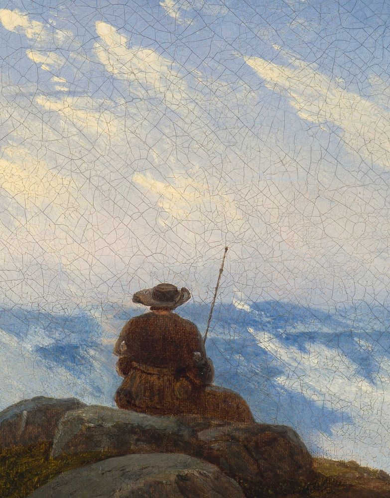 A traveler has climbed a winding path and rests with his staff on a mountaintop to look out over a sea of clouds. Lone, back-turned figures appear frequently in German Romantic art of the late 18th to 19th centuries. These figures represent a longing for unity with the vastness of nature, a characteristic of this art movement. Carl Gustav Carus described his own mystical experience in the mountains, writing “you lose yourself in boundless space…your ego vanishes; you are nothing, God is all.”