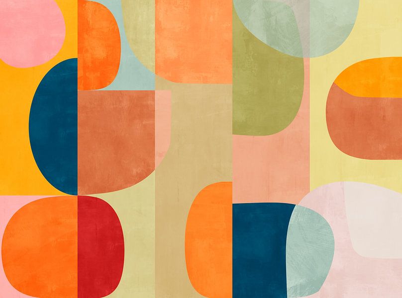 Bring a cheerful, modern vibe to your interior design with this abstract artwork featuring rounded blocks and overlapping shapes. Soft, textured colour fields in warm orange, coral, mustard yellow, blush pink, olive green and deep teal create a playful mid-century feel without looking cluttered. The balanced geometric pattern works well…