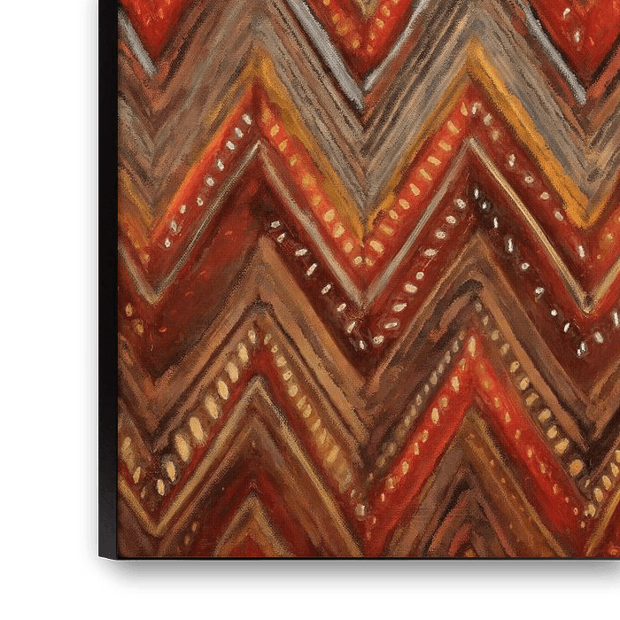 This work features a vibrant chevron pattern in warm hues such as red, orange and brown. The repeating zigzag shapes create a dynamic and rhythmic effect that draws attention and warms the room. The subtle variations in colour and texture give the work a sense of depth and movement. This composition is ideal for a living room or an office where an energetic and inviting atmosphere is desired. The warm colours create a cosy and pleasant ambience, perfect for embellishing a room and providing a sense of comfort.