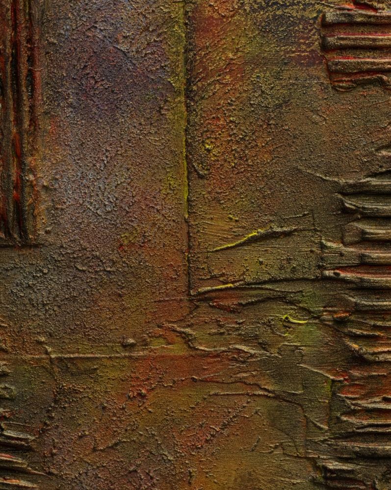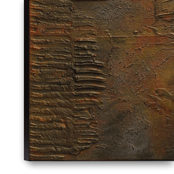 Warm abstract painting in terracotta and brown, with rich texture and a calm, earthy feel. The vertical and horizontal grooves give the work a luxurious, handmade depth. In the centre, the structure opens up slightly, making the whole feel warm and inviting.
