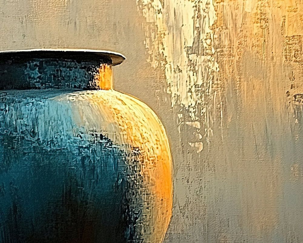 Warm Glow Redux - This still life painting shows a strikingly detailed, lushly coloured old vase on a rough wooden surface, bathed in a delicate play of light and shadow that highlights the texture and colour varieties.