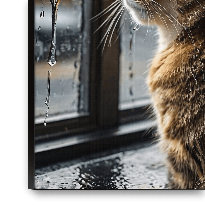 This atmospheric design shows a beautiful tabby cat looking out through a fogged-up window as raindrops adorn the glass. The image perfectly captures the melancholic mood of a rainy day, combined with the cat's curiosity and charm. Ideal for cat lovers and suitable as a work of art for modern interiors.