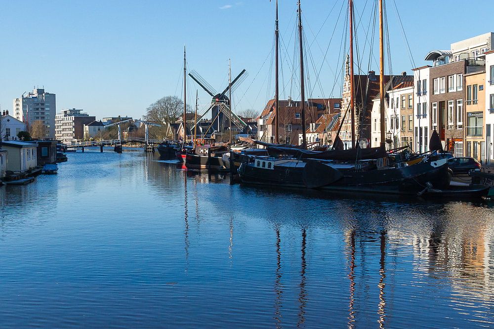 View of Galgewater in Leiden. A typical Dutch mood picture with windmill in the background.