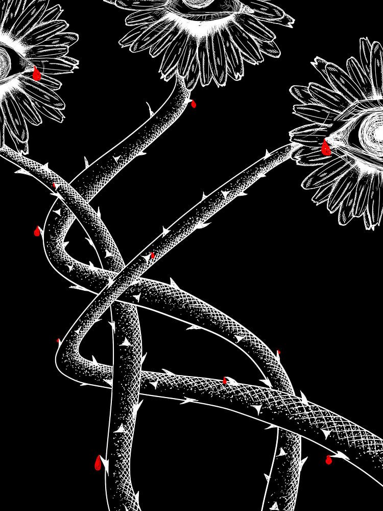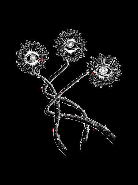 This black-and-white artwork shows three surreal flowers with eyes in the centre. The flowers are connected by long, thorny stems that wind around each other. Scattered throughout the work are small red accents, which contrast sharply with the black and white and draw immediate attention.