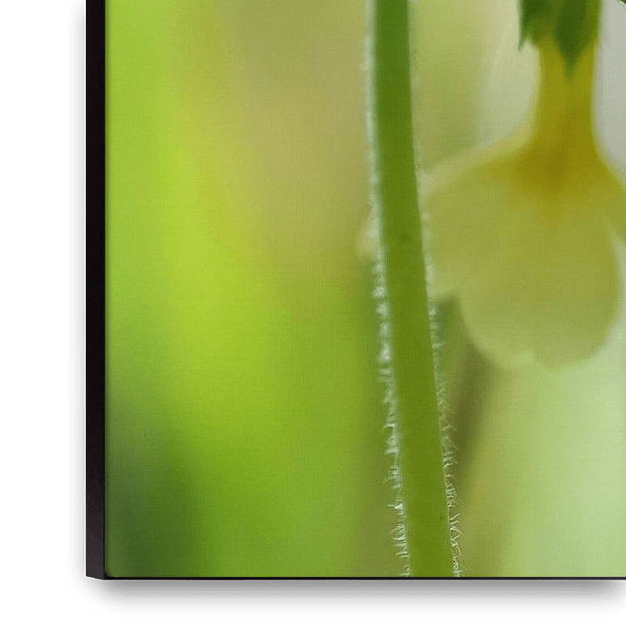 A photo of a slim primrose resembling a watercolor . The light yellow / green tones make it a fresh image . In the background bokehcirkels above