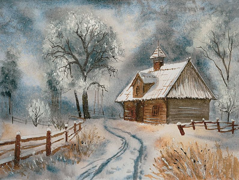 Watercolour or watercolour painting of a winter landscape. You can see a small log cabin among the trees. The snowy driveway between the fences shows tyre tracks.