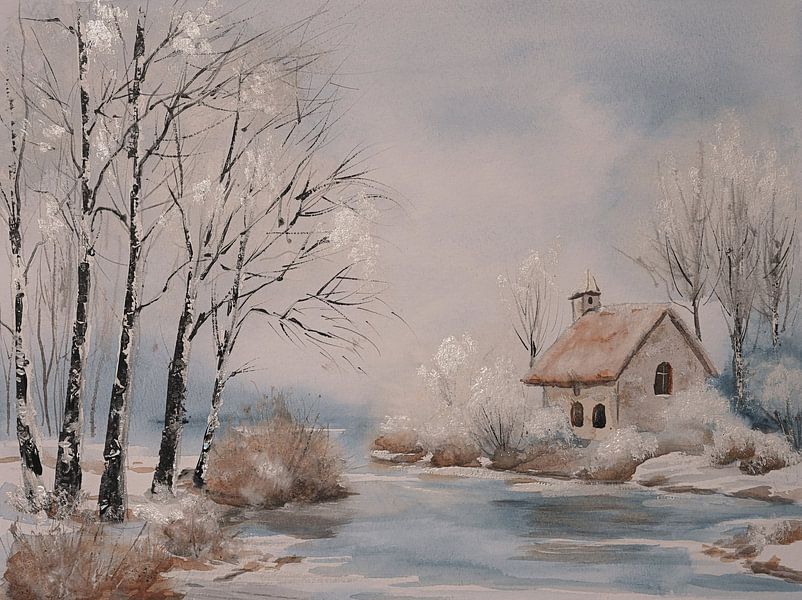 Watercolour painting of a winter landscape, featuring a lake and birch trees on the snow-covered shore. There is a charming little house on the opposite bank.