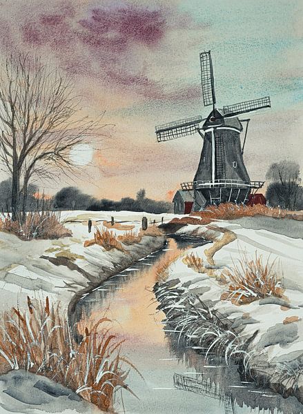 Watercolour painting of a winter landscape with a small ditch and a mill. There is snow on the ground and the rising sun creates a beautiful coloured sky.