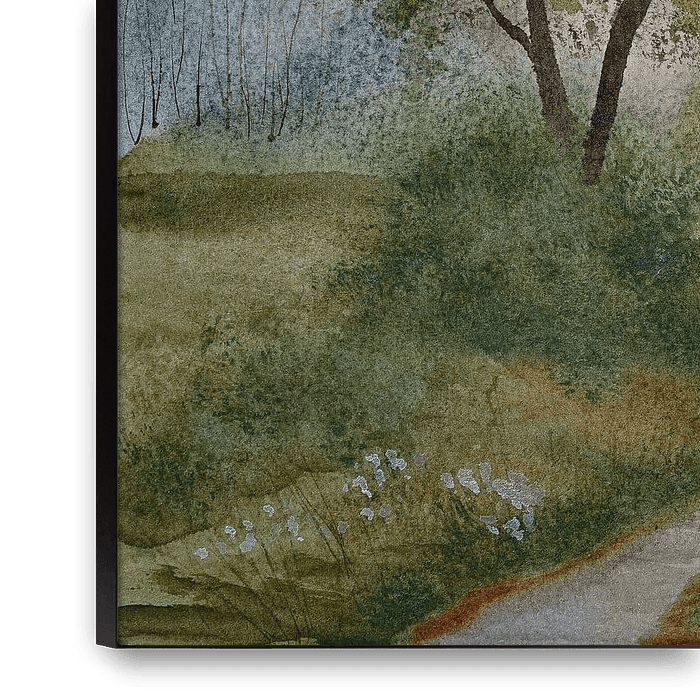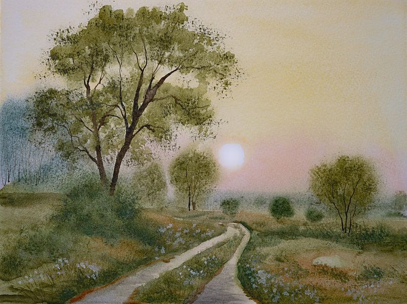 A watercolour painting of a spring landscape. You can see meadows stretching into the distance, bathed in the rising sun. A footpath winds its way through the trees.