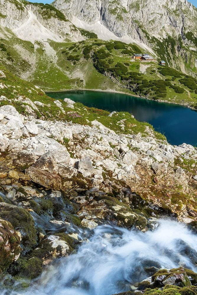 Waterfall at the Drachensee near Ehrwald in Tirol with Sonnenspitze and Coburger Hütte by Daniel Pahmeier