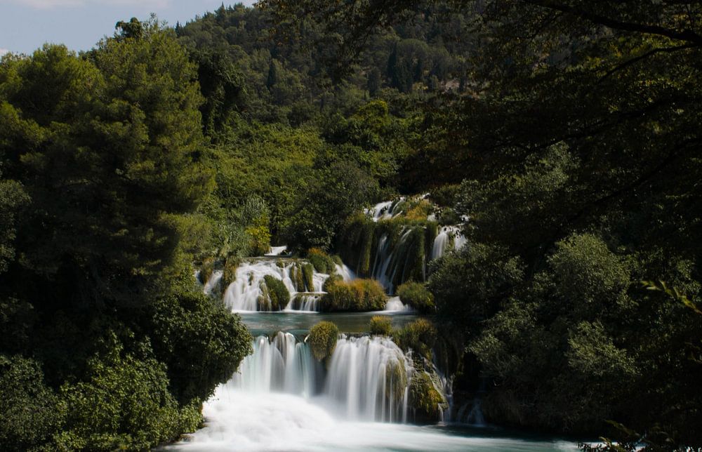 Een lange sluitertijd opname van een waterval in het Krka National Park in Kroatië. De lange sluitertijd zorgt ervoor dat het water op een deken van mist lijkt.