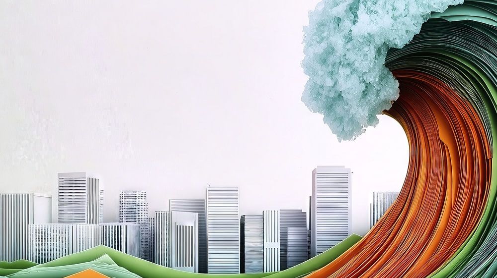 A huge wave of colourful sheets of paper crashes over a city, symbolising the excess of bureaucracy and paperwork in the modern business world. The vibrant colours and dynamic shapes of the sheets of paper reinforce the sense of overwhelm and chaos as they overwhelm the structured buildings of the city. This powerful depiction captures the challenges and stresses of today's business environment.