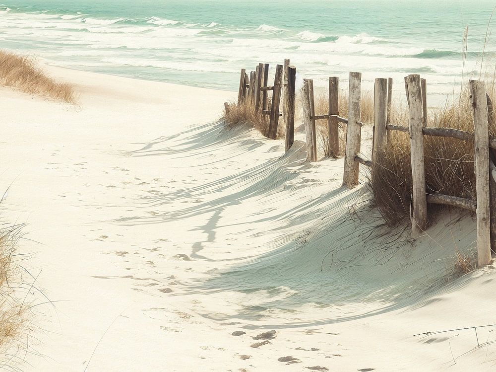 Mixed media artwork of a path through the dunes to the sea in vintage style.