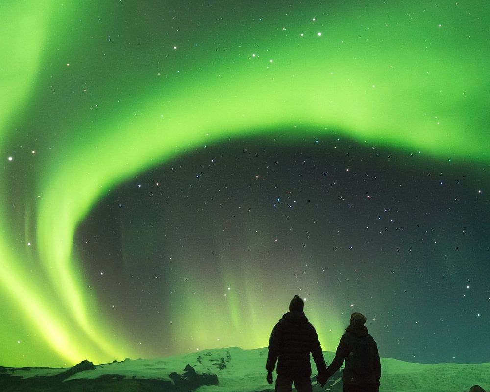 "We Will Always Be" captures a romantic scene of a couple holding hands under a mesmerizing aurora borealis. The vibrant green lights dance across the night sky while the landscape below remains quiet and serene. The contrast between the bright sky and the silhouettes of the couple creates an image that is both intimate and majestic.