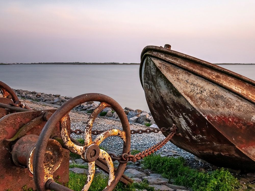 A hushed scene of a rusty winch and an old boat on the waterfront. Together, the weathered metal and soft colours of the sky create an atmosphere of nostalgia and transience. This coastal landscape exudes tranquillity and history, and fits perfectly into an industrial or maritime interior. An intriguing work for lovers of details, contrasts and the beauty of the landscape marked by time.