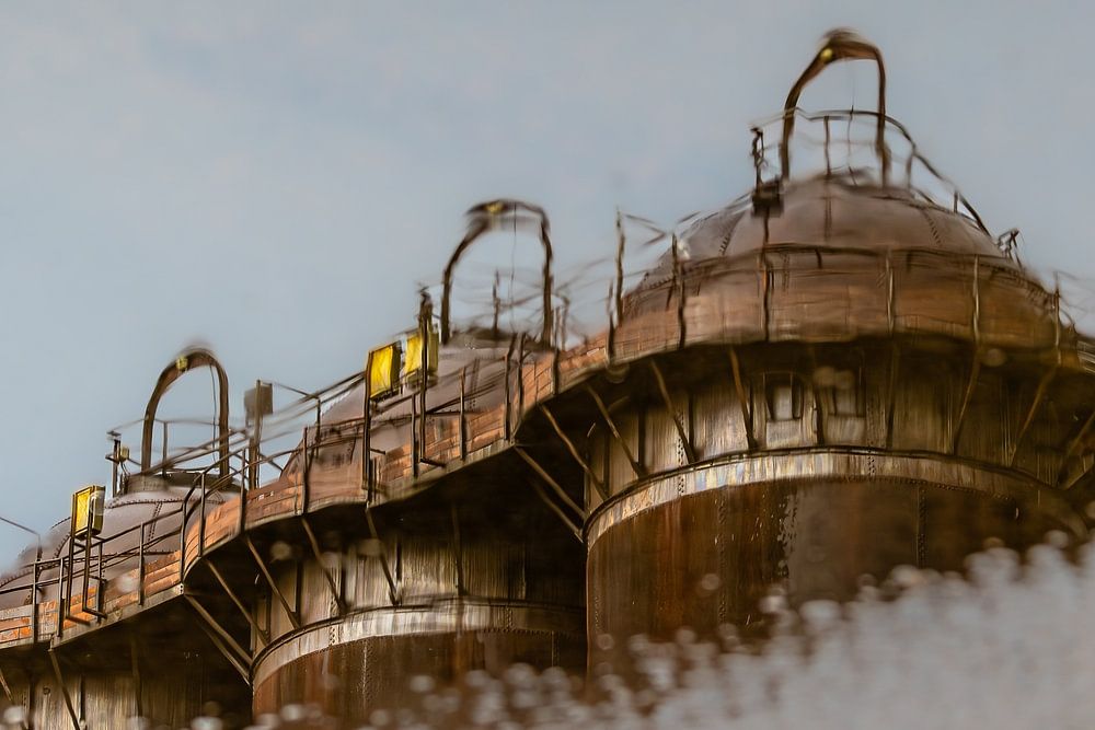 Steel and corrosion. The subject, 3 domes of a steel factory, is reflected in a rain puddle. Because the photo was taken in the puddle, the image was originally upside down. To make it more exciting, it has been flipped over so that you look straight at it. A slight ripple in the rainwater brings subtle movement to part of the subject.…