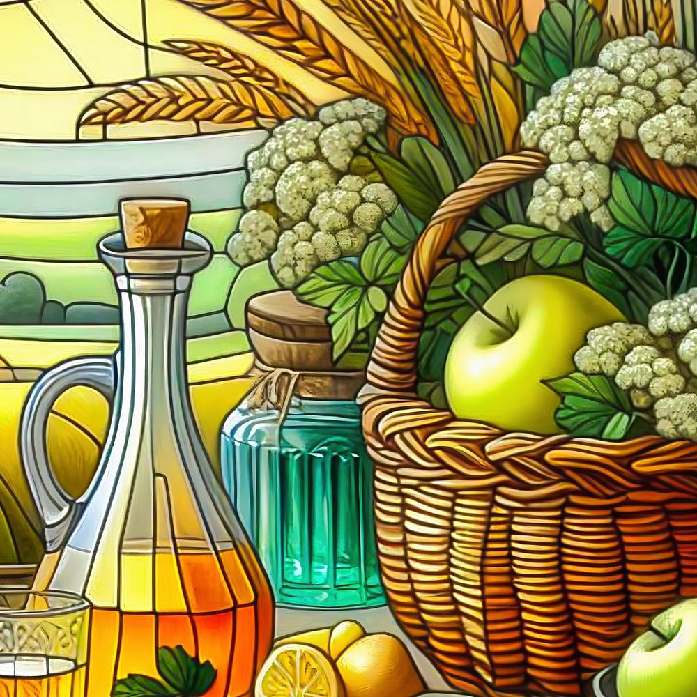 A tasty and well-stocked picnic table in a country setting. Stained-glass style image.