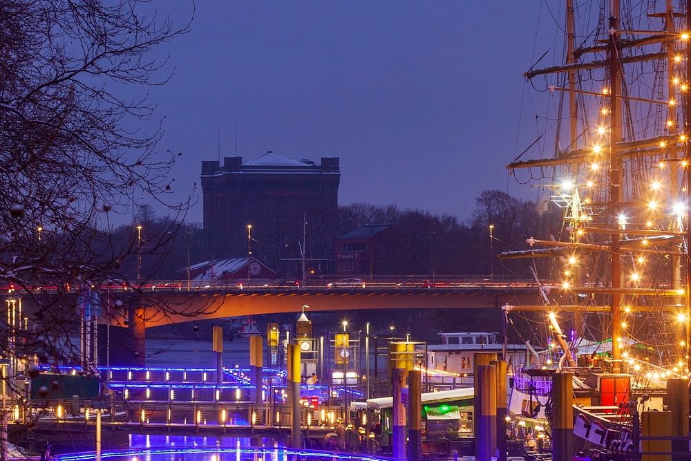 Weser with Christmas market Schlachtezauber water tower and sailing ship with snow , Bremen, Germany